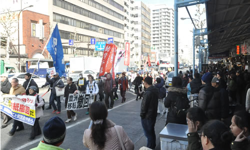 (写真 1月27日、命を奪う豊洲市場白紙撤回・築地デモが80人で行われた。歩道は大変な人だかり)