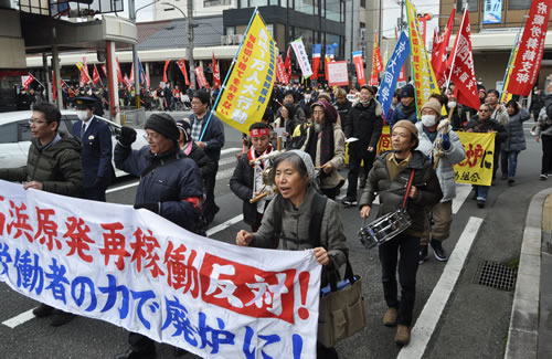 高浜原発3、4号機(福井県)の再稼働に向けた動きで緊迫する2月26日、京都府舞鶴市の赤れんがパークで、自治体労働組合を中心とした実行委員会が呼びかける集会が500人の参加でかちとられた。