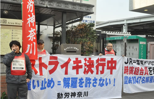 朝7時、ストライキに入った桑原副委員長は、小田原駅の改札から出てきて集まった支援の仲間に拍手で迎えられた。その後、さらに20人で小田原駅前街宣とアクセス事務所への弾劾行動、職場で働く仲間へのアピールを行った。中村幸夫委員長は「多くの青年が非正規職にされている。職場で文句を言ったら首を切られる。これをつくり出したのが国鉄分割・民営化だ」とJRを弾劾。時廣慎一書記長は「会社は『ストなんてできない』と言ってきたが、一人の勇気が必ず社会に伝わる。そのつもりでストライキに決起している。青年のみなさん。労働組合を立ち上げ、私たちと一緒に闘おう」と呼びかけた。桑原副委員長は勝利感に満ちて「これからもストライキで闘う」と宣言した。