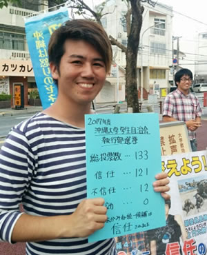 5月18日から23日まで行われた沖縄大学生自治会執行部選挙は、総投票数133票のうち赤嶺知晃委員長候補と上門大樹副委員長候補への信任票が121票投じられました。赤嶺統一候補への圧倒的支持をつくりだした核心には、今回の執行部選挙に上門君(法経3年)が副委員長候補として赤嶺委員長候補とともに立候補したことがあります。