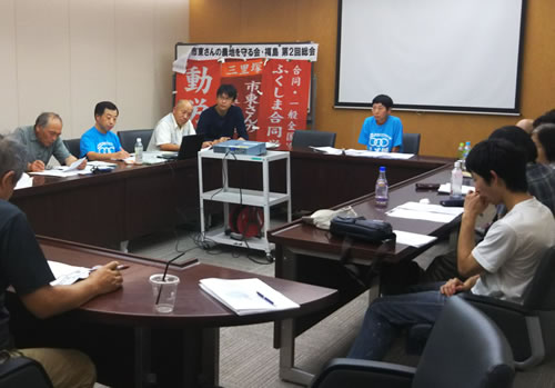 8月27日、「市東さんの農地を守る会・福島」の総会を、郡山駅前の会場で開催しました。三里塚50年の闘いを記録したDVD上映後、冒頭に北原鉱治さんへの黙禱(もくとう)を行いました。