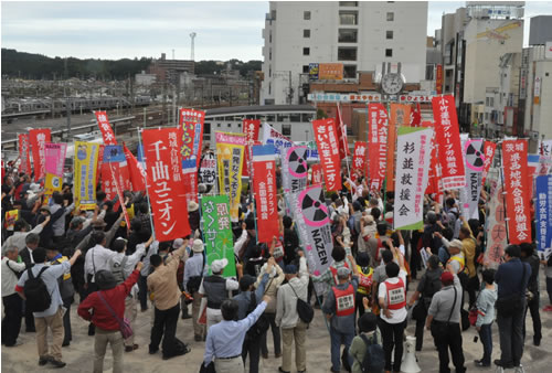 集会後のデモ行進がいわき駅前に到着すると、鈴なりの大注目で迎えられた。