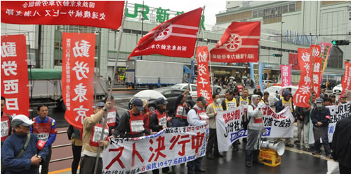 正午から動労総連合の主催でJR東日本本社への抗議行動が行われた。動労総連合を先頭に100人が結集し、総選挙のさなかで階級的労働運動の力を見せつけた。動労東京のスト要求をJR本社に突きつけ、国鉄分割・民営化によって解雇された1047名の解雇撤回を求める動労千葉に対し団交にも応じないJRを弾劾し、10月14日のダイヤ改定と21日に強行しようとしている常磐線の竜田―富岡間延伸に抗議した。
