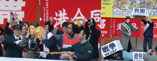 僕は11月5日の労働者集会に職場の人に誘われて参加しました。後半の改憲阻止!1万人大行進での寸劇「労働者階級に生まれてよかった!」に、群衆役として参加しました。