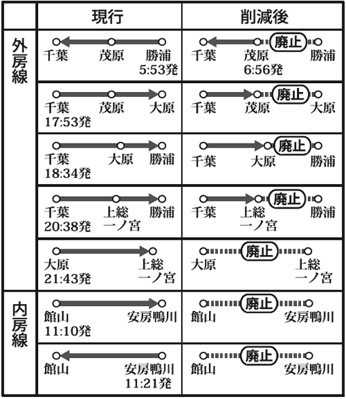 JR千葉支社管内でも、重大な攻撃がかけられている。JR千葉支社は昨年3月のダイヤ改定で、昼間時間帯の館山―千葉間の直通列車を全廃した。これに続き今回は、外房線の茂原あるいは上総一ノ宮以南の普通列車を切り捨てる。廃止の対象は朝夕の通勤・通学時間帯の列車だ。外房地域は人が住めなくなっても構わないというのが、JRの姿勢だ。