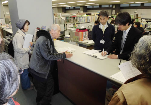 西川事務局長は、「皆さんは公務員でしょ。公務員は憲法99条で憲法の順守義務が定められているんですよ。この訓練は明らかに戦争のためであって、国や都が指示してきたからといって、断るべき時はきちんと断るべきなんですよ」「私たちは職員の皆さんに文句を言いに来たのではなく、戦争の歴史を繰り返さないという立場を共有したいから、こうして訪ねてきたのです」と、熱く語った。