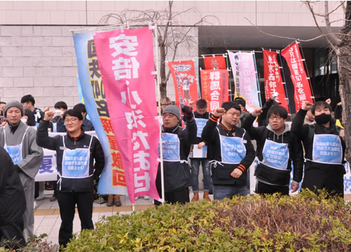 2月21日から3月9日、韓国・亀尾(クミ)から解雇撤回・原職復帰を求めて旭硝子(ガラス)本社にやってきた旭非正規職支会も、動労千葉を頼ってやってきた。社内下請け労働者が労組を結成した途端に全員解雇されたのだ。