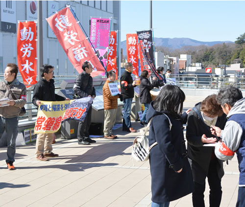 東京からは江戸川区職の佐藤賢一さんと都庁議事堂レストラン解雇と闘う柿沼庸子さんが参加し、「被曝労働拒否とともに、公務員労働者は戦争協力を拒否して闘う」「放射能が脅かす命と健康の問題を真剣に考え、未来のために立ち上がろう」と訴えた。動労水戸組合員と動労福島、全学連の仲間も訴え、2時間で400枚以上のビラを配り、54筆の署名が集まった。