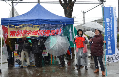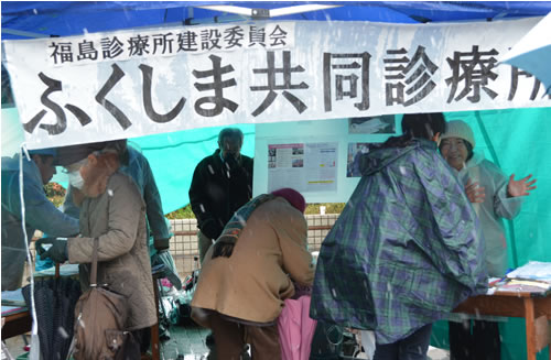 ふくしま共同診療所のブース(写真上)では、診療所の布施幸彦院長、佐藤幸子さん、椎名千恵子さんたちが被曝と帰還強制反対署名を訴え、208筆を集めた。動労水戸のブース(写真下)では石井真一委員長らが常磐線全線開通反対署名を訴えた。参加者は「とんでもない話」だと怒りを露わに次々と署名に応じ、223筆に達した。