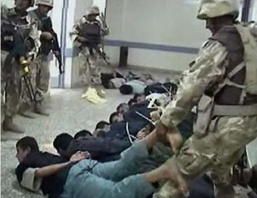 (写真 ファルージャでの大虐殺 人口約25万人のファルージャで米軍は2004年、二度にわたり市街を封鎖・包囲し掃討作戦を展開した。町を徹底的に破壊し、4月に住民約800人、11月に約6千人を虐殺。写真は11月、病院で住民を拘束する米兵)