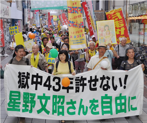 6月3日、四国地方更生保護委員会がある香川県高松市で「無実で獄中43年 星野文昭さん解放全国集会」とパレード(主催/星野さんをとり戻そう!全国再審連絡会議)が行われた。更生保護委員会への要望書は5千を超え、5月20日に地元新聞に全面意見広告を実現。星野さんを冤罪の獄から奪い返そうという執念の闘いは1000人の大闘争となり、星野さん解放へ新たな、大きな展望を開いた。(関連記事2面)