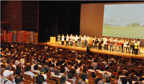 地元四国の青年を先頭に全国の青年労働者が壇上に勢ぞろいし、星野暁子さんの詩を群読した。そして、最後に青年たちの思いを込めて「再び近づく戦争の足音、戦争は二度と繰り返させない」「星野さんを取り戻すということは自分自身を取り戻すこと、だから絶対に取り戻したい! 取り戻そう! こんな社会も変えよう!」と呼びかけた。星野さんの存在と闘いが世代を継いで青年たちの確信となっている。