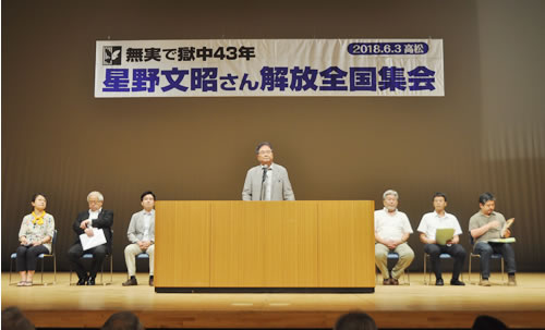再審闘争の中で開示された証拠の中に星野さん無実の証拠が見つかったことから、全証拠を開示させることが重要であり、運動を拡大し、さらに無期懲役刑の確定から30年が経過した今年、四国更生保護委員会に働きかけ、星野さんの仮釈放をかちとろうと呼びかけた。大坂弁護団も星野闘争と一体となって大坂さんの無実を明らかにする決意を述べた。