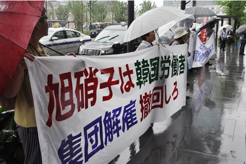 2015年5月、韓国・クミ(亀尾)市の旭硝子(ガラス)工場で働く非正規職労働者が劣悪な労働条件に抗し労働組合を結成したが、1カ月後、旭硝子は突如、社内下請け会社との契約を解除、178人が集団解雇された。争議解決のため今年5月26日に日本で結成された旭非正規職支会支援共闘会議が、6月11日、第1波闘争として東京・丸の内の旭硝子本社への抗議行動を闘った。