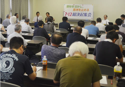 (写真 築地市場内で開かれた「築地を活かし、豊洲を止める7・12総決起集会」)