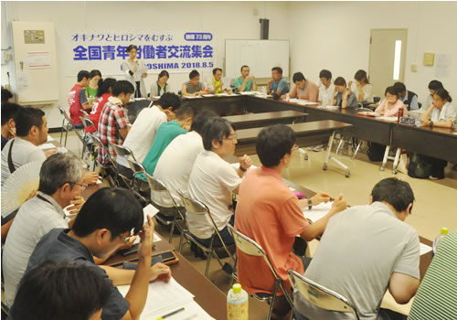 8月5日、広島市でオキナワとヒロシマを結ぶ全国青年労働者交流集会が開催され75人が集まった(写真)。集会の最初に、西日本豪雨災害について自治労倉敷市職員組合の百本敏昭副委員長が、倉敷市真備町の被災は地方切り捨てによる人災だと弾劾した。