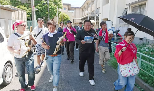 夏まつりの午前中、関西青年実行委員会の仲間と、鉦(かね)、太鼓、コールを順番に代わりながら、練り歩きをしました(写真)。すごく団結を感じ、とても楽しかったです。