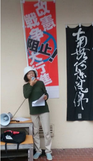 私は、安芸太田(あきおおた)町議会議員をしています。婦人民主クラブ全国協議会などの仲間と共に、地域で改憲阻止の署名活動や、町議会での改憲反対決議を求める要望書の提出を行っています。(改憲・戦争阻止!大行進広島実行委員会共同代表/広島県安芸太田町議会議員・大江厚子)