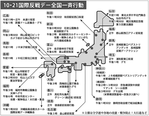 国際反戦デー全国一斉行動は、安倍政権の進める改憲・戦争政策に対抗し、戦争扇動のイデオロギーを打ち破るための出発点です。改憲が戦後史上はじめて具体的日程に上がり、自衛隊の軍備強化から職場の戦争動員体制構築まで、戦争に向けた国内の準備も進められています。私たちは、改憲・戦争が具体的焦点となる歴史的局面にいるのです。国際反戦デー全国一斉行動と11・4全国労働者集会で、労働者民衆が主人公となる改憲・戦争阻止の大運動をつくり出していきましょう。