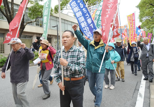 正午から千葉市中央公園で決起集会が開かれた。東峰の萩原富夫さんは、「この裁判を約2年闘い抜いて強制執行を阻止してきた。絶対に勝利しよう」と檄(げき)を飛ばした。動労千葉の川崎昌浩書記長は、成田空港の犯罪性と安倍政権の改憲攻撃を鋭く批判し、10・14三里塚集会と11・4全国労働者集会への決起を呼びかけた。関西実行委、市東さんの農地取り上げに反対する会の発言に続き、全学連の高原恭平委員長は、半世紀を超えて国家権力と非和解で闘う三里塚闘争の意義を確認した。