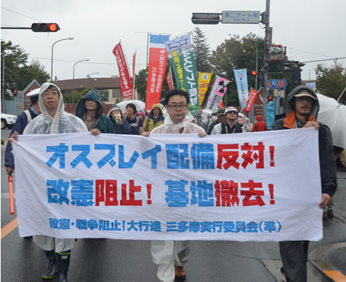 台風が迫る午後3時すぎ、デモ隊は横田基地に向けて出発。「オスプレイ配備反対!」「改憲阻止!戦争反対!」ののぼり旗を林立させ、基地の第5ゲートから第2ゲートに向けて国道16号線を北上します。