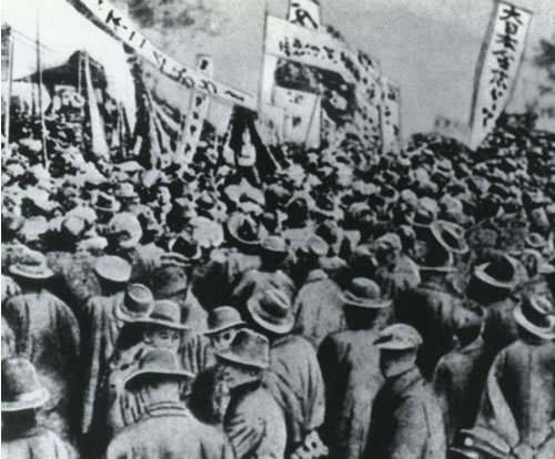1917年のロシア革命は、全世界の労働者に勇気と感動を与え、闘いのうねりは全世界に広がった。「俺たちにも天下がとれる!」と全世界で労働者民衆の闘いが燃え上がった。翌年、日本では米騒動が闘われ、19年3月の「普通選挙権」を求める日比谷公園の集会には5万人が集まった。日本帝国主義が暴力的な植民地支配を行っていた朝鮮では、独立を求める運動が全土に広がり、各地でデモが行われ、警察や憲兵隊の事務所が人民に襲われた。中国では北京大学の学生を先頭に反日帝・反封建の五・四運動が巨大な炎となって燃え上がった。