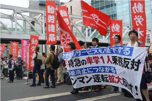 動労東京の吉野元久委員長が司会を務め、動労総連合の田中康宏委員長が行動の趣旨を道行く人びとに訴えた。田中委員長は、福島第一原発事故がなんら収束していない中で、原発の直近に電車を走らせる常磐線の全線開通は労働者と乗客に被曝を強いる暴挙であること、常磐線特急の車掌削減は鉄道の安全を崩壊させることを暴いた。また、国鉄分割・民営化による解雇は2千万人が非正規職とされた現在の社会の出発点になったからこそ解雇撤回闘争を継続すると表明した。