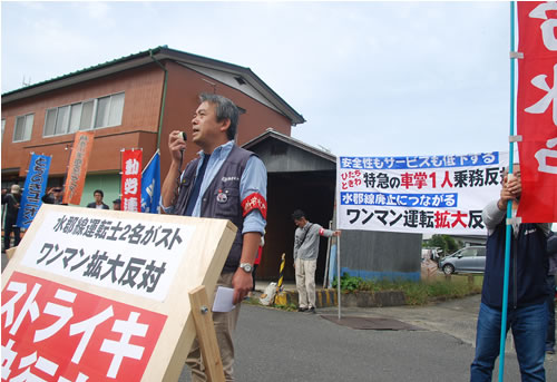 16日、水郡線・大子運輸科で木村郁夫書記長と外岡弘執行委員の2人の運転士がストライキに入った。