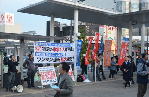 ストライキに先立ち、動労水戸は常磐線や水郡線の各駅で連日の街頭宣伝を続けてきた。JRの極限的な合理化と人員削減を暴き、「安全を守ることが労働組合の社会的使命」と訴える動労水戸に、地域住民から激励の声が寄せられた。