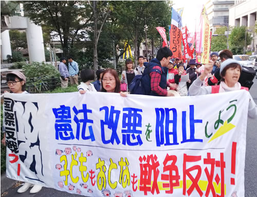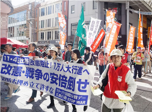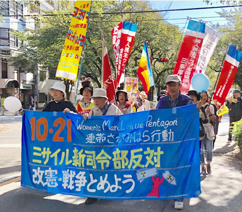 国際反戦デーの10月21日、全学連を先頭に東京で行われた銀座デモ(記事1面)に加え、東北、関東、北陸、東海、関西、四国、中国、九州、沖縄など全国23カ所以上で、安倍政権が狙う改憲・戦争に反対するデモや街宣、学習会などさまざまな行動が行われました。そのうちの一部と、アメリカの首都ワシントン周辺で闘われた「女性たちのペンタゴン・マーチ」をあわせて紹介します。(編集局)