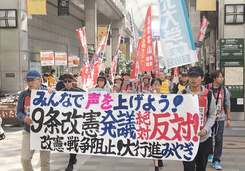 広島大学学生自治会と改憲・戦争阻止!大行進実行委員会広島の主催で原爆ドーム前集会と広島市内デモを行い、50人が結集しました。集会の司会は広大自治会委員長の森田寛隆君が務め、ともに改憲阻止を闘ってきた学生が基調提起を担いました。