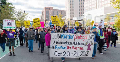1967年、アメリカ帝国主義のベトナム侵略に反対して5万人が立ち上がった「ペンタゴン・マーチ」から51年。この日、白人やアフリカ系、ラティーノ、アジア系の女性を先頭に、さまざまな人種や民族の人びとが首都ワシントンの道路を埋めました。打楽器のリズムにのせて「ピース・ノット・ウォー」「正義なくして平和なし」などのコールが響きます。スペイン語で「団結した人民は絶対に負けない!」のコールも。色とりどりのプラカードも参加者の手づくりです。「侵略戦争にではなく雇用と医療、教育に予算を!」「沖縄・辺野古への基地建設をやめろ」というボードも掲げられました。