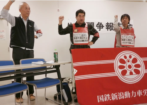 9月25日、新潟市内で開催された動労総連合・新潟主催のJR―NTS(JR新潟鉄道サービス)非正規職解雇撤回の労働委員会闘争報告会では、参加した労働者からこのような激励のことばがかけられました。