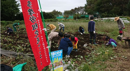 この日、収穫したのは5月に植えたサツマイモです。心配していた雨も降らず、畑には20人近くが集まりました。イモは大豊作! 大きい! 生い茂る葉と土の下から次々姿を現す大きなイモに大人も子どもも大興奮。