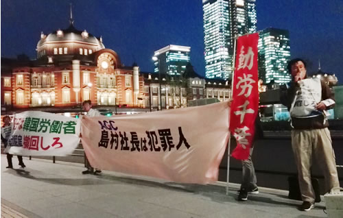 10月26日夕、韓国・クミの旭非正規職支会の解雇撤回を闘う旭支会支援共闘会議は、動労千葉を先頭にAGC本社がある東京駅丸の内北口で街頭宣伝に立った。この日、旭支会は、テグ雇用労働庁での座り込み16日目を迎え、全国の非正規労働者と共に労働積弊清算を要求する記者会見を行った。労働者の国際連帯の力で世界を変えよう!