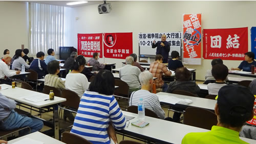 10月21日、八尾プリズムホールで「改憲・戦争阻止!大行進八尾」の結成集会をかちとりました。八尾北医療センター労働組合、全国水平同盟西郡支部、八尾北命と健康を守る会を始めとした八尾北夏まつり実行委員会に結集する仲間、ビラを見て駆けつけた人、星野絵画展でつながった人などが参加し、熱気ある集会となりました。