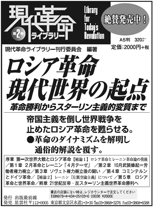 1991年にソ連が崩壊したことをもってロシア革命が全否定されてきた。共産主義は必ずソ連のような共産党の特権階級が独裁する人民抑圧体制になるという俗説が支配してきた。だがそれは、まさにスターリン主義による一国社会主義論を論拠とする国際共産主義運動の反革命的変質の故にもたらされたものだったのだ。この途方もない裏切りを徹底的に明らかにし、ロシア革命本来の労働者階級自己解放の闘いをよみがえらせることは、今現在の、命よりも金もうけの新自由主義、戦争によってしか生き延びられない帝国主義の体制を打倒する闘いにとって不可欠の課題だ。