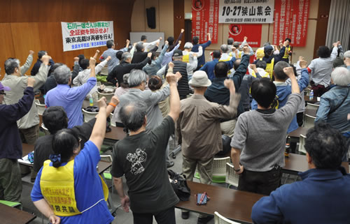 集会のまとめと行動提起は「残り1週間、死力を尽くし11・4の組織化を」。全体が決意を込めて団結ガンバローを行った。