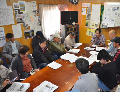 朝の打ち合わせ(写真)では、「市東さんの農地取り上げ強制執行を千葉地裁は認めるな」という要望書・メッセージを周辺住民から集めることを確認し、一同は担当地域へ。用意された反対同盟ニュース第61号は、10・14全国集会の息吹を地域に伝え、11・19千葉地裁包囲行動への参加を呼びかけるものだ。