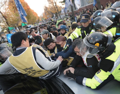 青瓦台前では約500人の武装警察がデモ隊の行く手を阻み、これを突破し前に出ようとするデモ隊と衝突。午後3時30分頃、非正規職の代表者数人が前に出て、青瓦台に対して面談要求に応じろと要求したが、道は開かれず、さらなる激突となった。