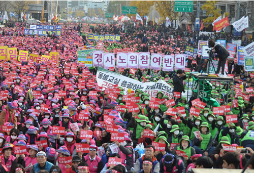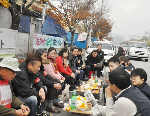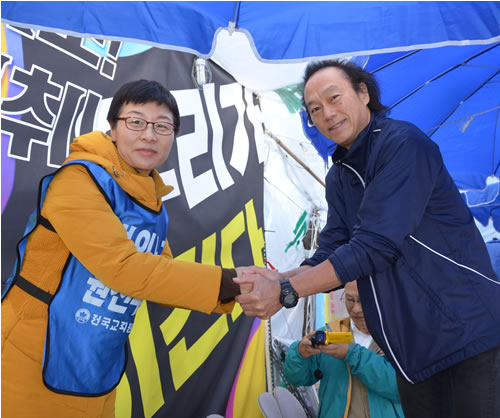 11月12日午前、全教組(全国教職員労働組合)の皆さんと団結・連帯するため、青瓦台の直近の籠城(ろうじょう)テントを訪れた。教育労働者を中心に大行進横須賀実行委員会の仲間5人と東京からも2人が駆け付け、全教組首席副委員長のパクオクチュさんらが迎えてくれた。