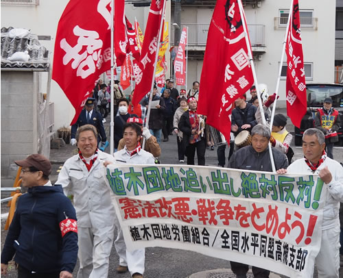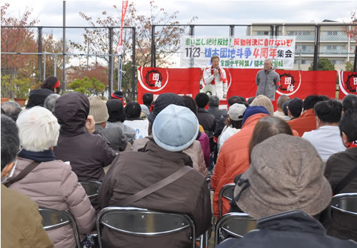 11月23日、闘う労働組合の仲間、全国水平同盟の仲間100人が大阪・高槻市の植木団地に結集して、「植木団地追い出し絶対反対!改憲・戦争をとめよう!11・23植木団地闘争勝利4周年集会」がかちとられました。集会後は今年一番の寒さを吹き飛ばし、富寿栄(ふすえ)団地までデモ行進し、熱い注目を浴びました。