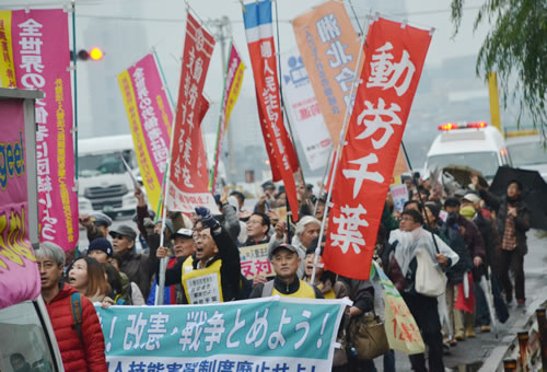 近くの公園でデモを終え、動労千葉の田中康宏委員長が次のように訴えた。「11月集会の成功を踏まえて入管戦線版の大行進運動を始めたいと、急きょ集会・デモを呼びかけました。地響きのような歓声を聞いて、改めて真剣に闘わなければならないと決意した。技能実習制度も、新たな外国人労働力の導入政策も現代の奴隷制度だ。僕らは本当の意味で奴隷制度粉砕闘争に立ち上がらなくてはいけない。これが私たちの改憲・戦争阻止とひとつになった入管法粉砕闘争だ」。最後に「世界の労働者と団結し、戦争・改憲の安倍政権を倒そう」と団結ガンバローで締めた。
