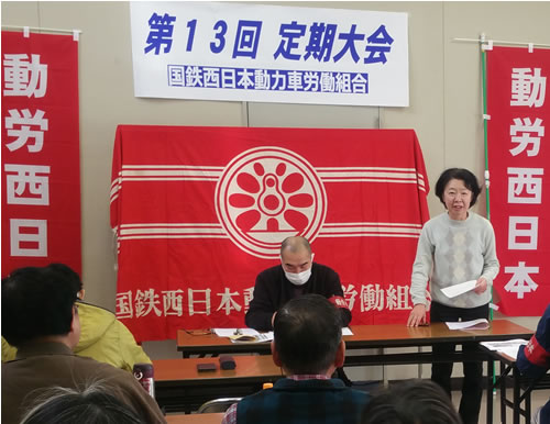 戦争絶対反対、改憲発議はさせない、教育を戦争体制づくりの手段にさせない、地方切り捨て許さない。その力を持っているのは、労働者民衆であることを、仲間と共に街宣行動や労組回り、議会報告を載せた議会だよりの各戸配布で訴えていきます。(写真は、1・20動労西日本大会であいさつする大江さん)