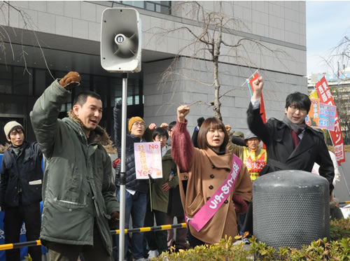 高原恭平全学連委員長が「安倍は火だるま状態だと言われているが、こちらが気を緩めればいつでも改憲に突進してくる。安倍を倒し、改憲を阻止しよう」と呼びかけた。続いて、大行進運動の呼びかけ人であり、とめよう戦争への道!百万人署名運動の西川重則事務局長が改憲・戦争を止めるためにともに闘おうと訴えた。4月杉並区議選に立候補するほらぐちともこさんが改憲阻止の選挙として闘う決意を語った。1時間の集会を意気高くかちとって、正午から統一行動に合流した。