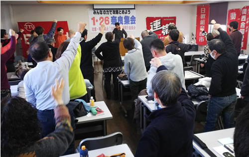 (写真 「改憲攻撃を安倍政権もろとも葬り去ろう」。6労組が呼びかけた集会の最後に団結がんばろうを三唱した【1月26日 奈良市】)