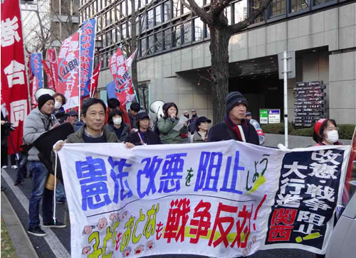 1月19日、改憲・戦争阻止!大行進・関西の呼びかけで、「改憲・戦争させへん!1・19大行進」が行われ、120人の仲間が靭(うつぼ)公園に集まりました。