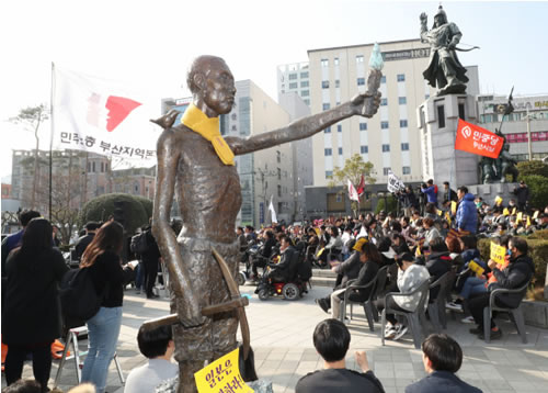 3月1日、民主労総がムンジェイン政権による弾力勤労制(変形労働時間制)拡大に反対して3・6ゼネストを構える中、全国で行動が行われた。プサン(釜山)では民主労総が主導して市民大会を開催し、日本政府や戦犯企業に謝罪・賠償を求めた。徴用工像を日本総領事館前に設置しようとしたが、許しがたいことに日本政府の要請を受けた警察に阻止された。