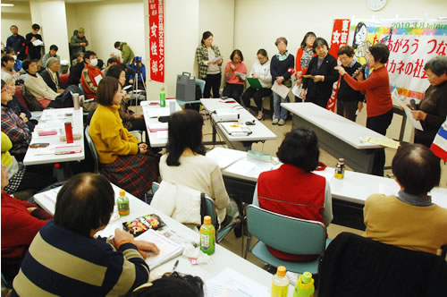 続いて1分間アピールでも、郵政非正規職女性労働者の闘い、築地問題、障害者の介護保険強制移行反対、羽田空港の危険な都心飛行ルート絶対反対、特区連の大幅賃下げとの闘い、生活保護切り捨てとの闘い、阿佐ケ谷再開発反対、病院職場の非正規職問題など、次々と元気に闘いの報告がされました。