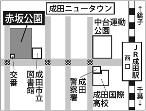 会場はJR成田駅より約2キロ。バスは成田駅西口2番乗り場から中台線「赤坂公園」または、中央通り線「保健福祉館」で下車